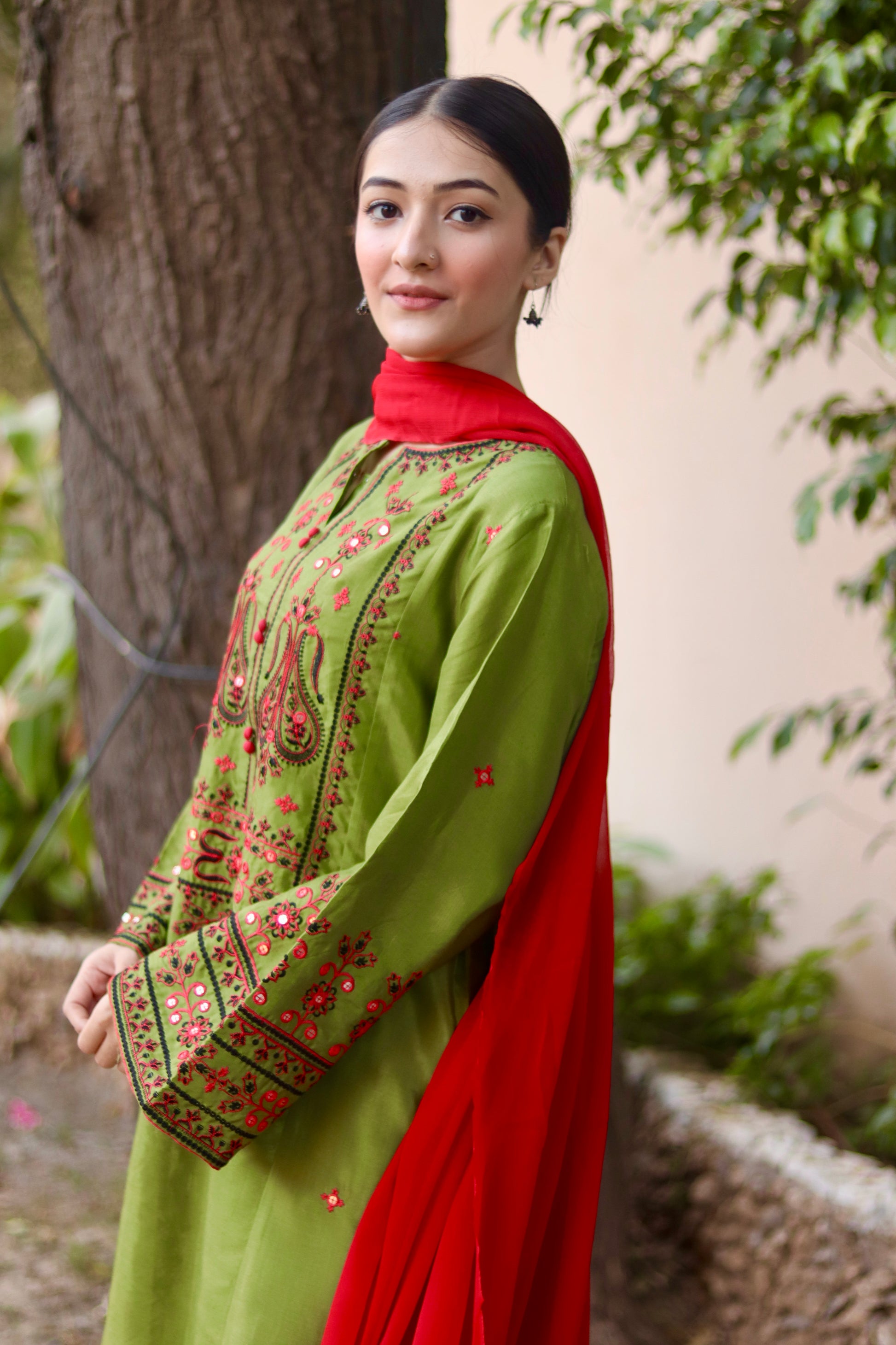 Radiant emerald raw silk mehndi colour dress with intricate embroidery, available in 2pc and 3pc styles, paired with an elegant crinkle chiffon dupatta for timeless celebration wear.