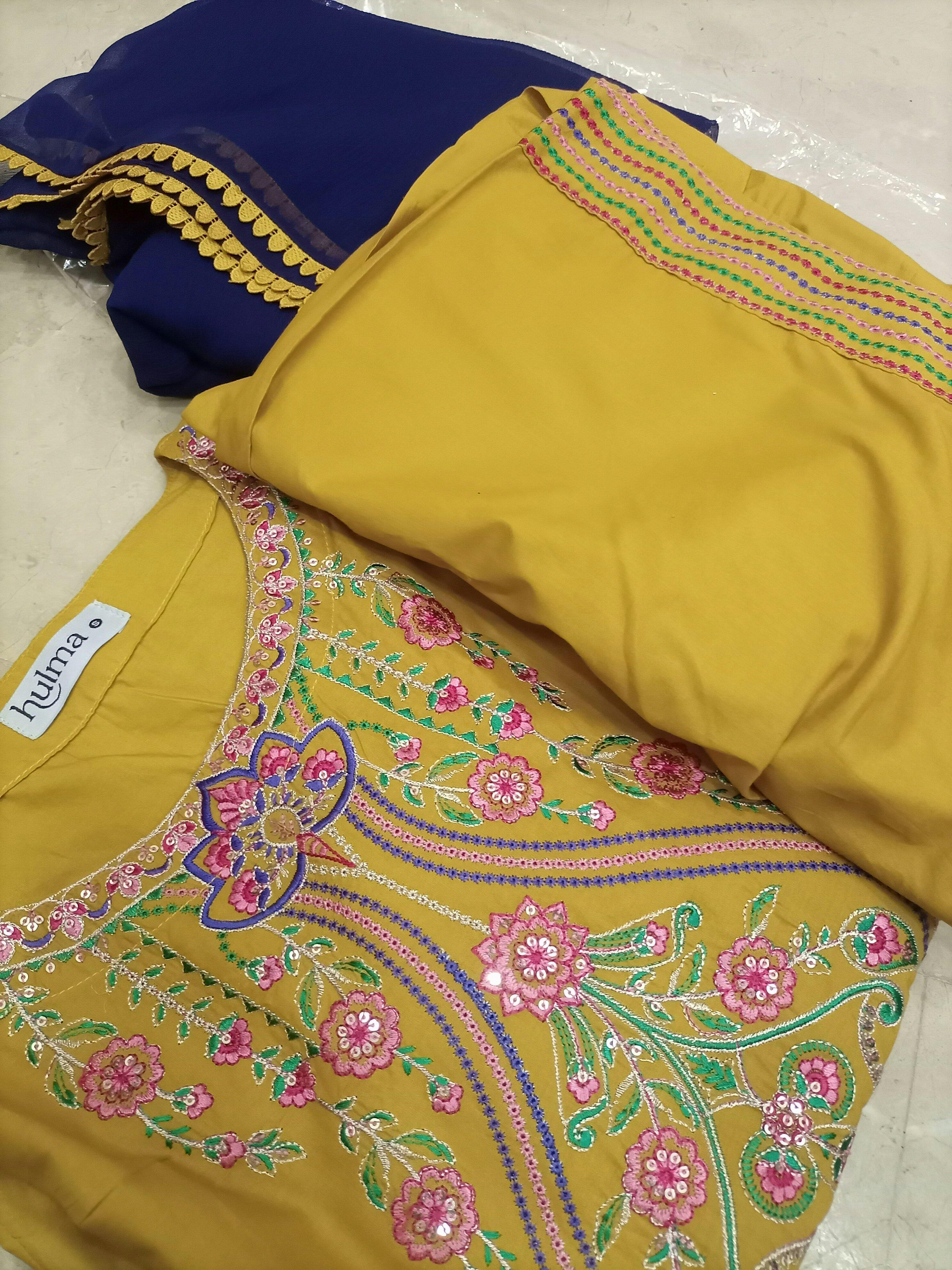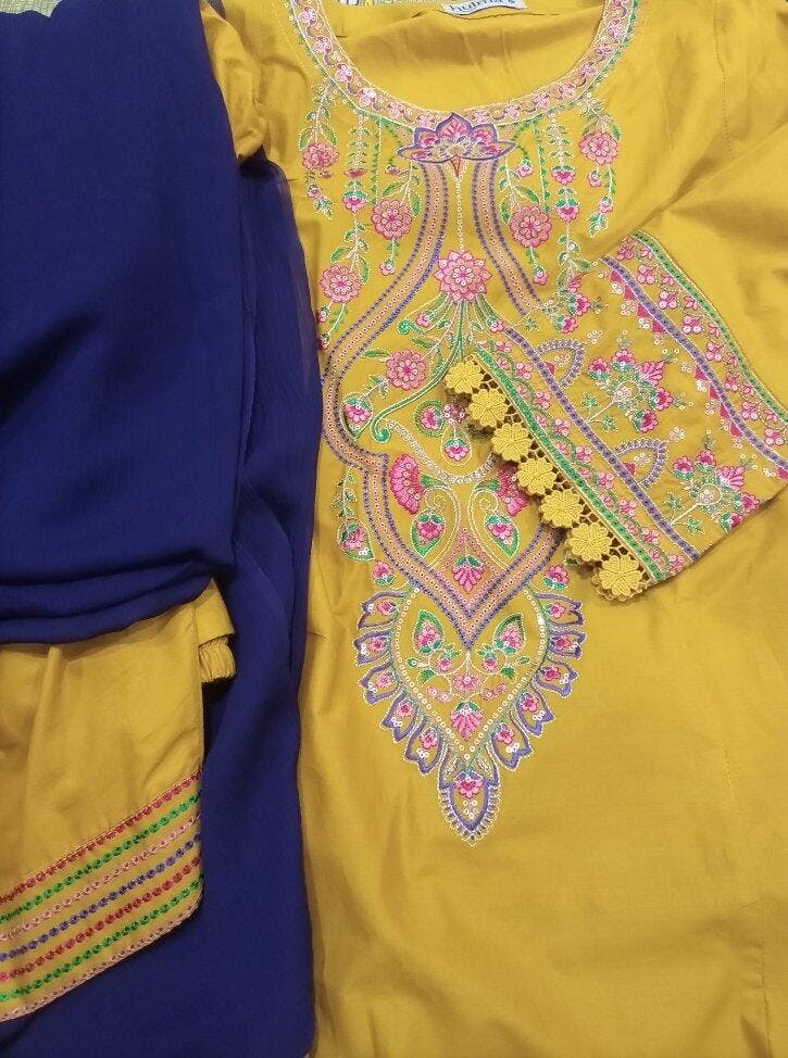 This Mustard Embroidered Lawn Suit showcases exquisite embroidery on the neckline, sleeves, and trouser edges. Offered in 2-piece and 3-piece sets, it features a soft chiffon dupatta paired with breathable lawn fabric, providing both comfort and elegance for warm climates. Ideal for individuals desiring a sophisticated and classic ensemble crafted with precision.